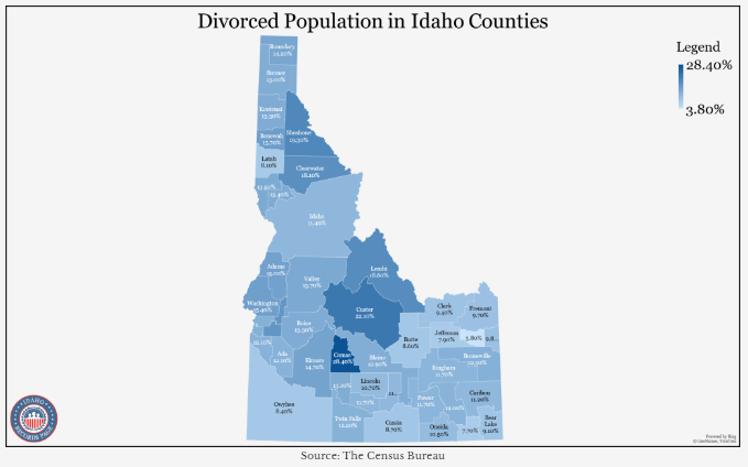 The state has centralized birth and death records since 1911 and marriage and divorce records since 1947. Idaho also reports this information to the United States Census. For example, the image below displays the divorced population of each Idaho county: